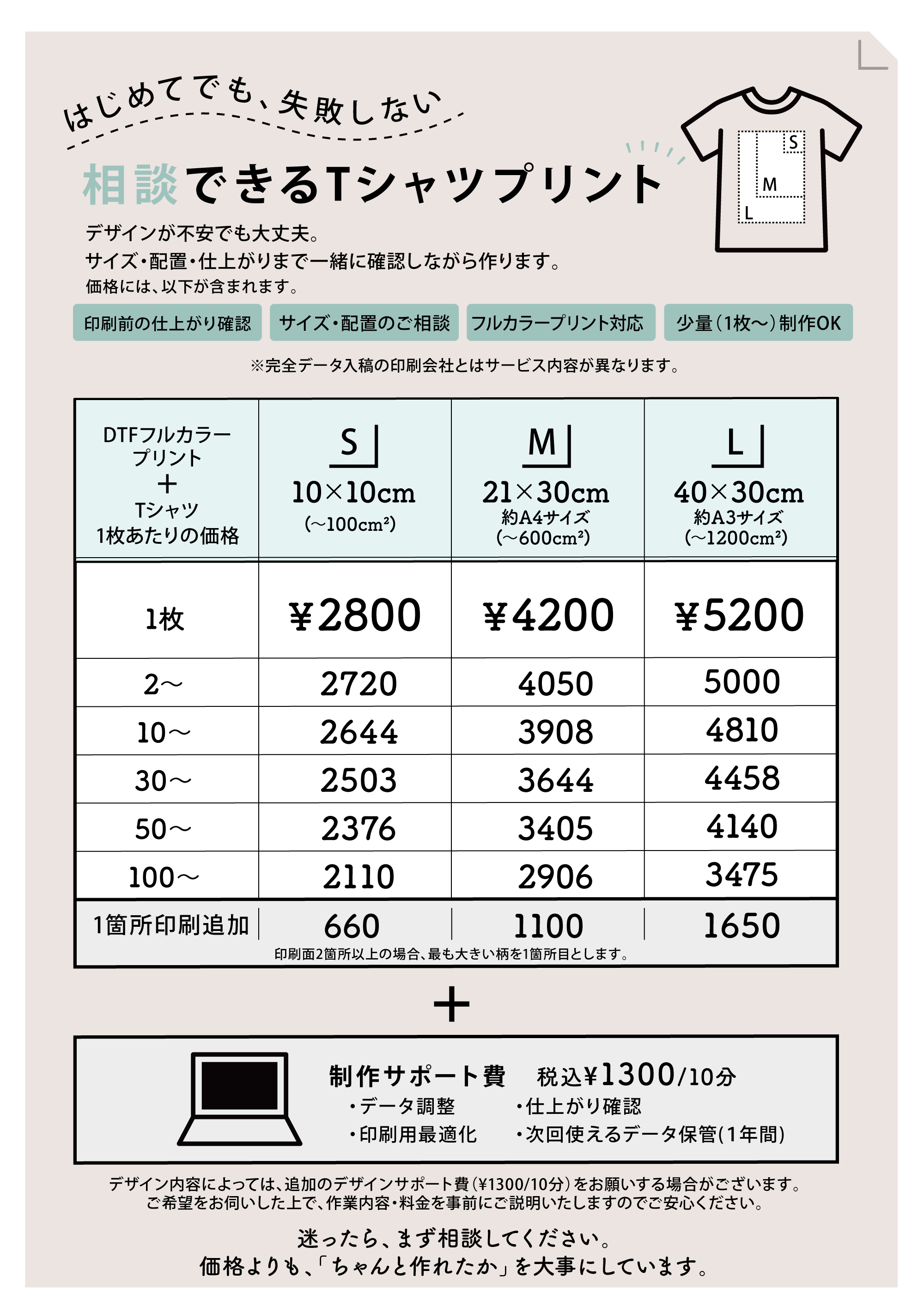 持ち込み手数料+印刷代(上記金額からTシャツ代1200円をひいた金額)+制作サポート費